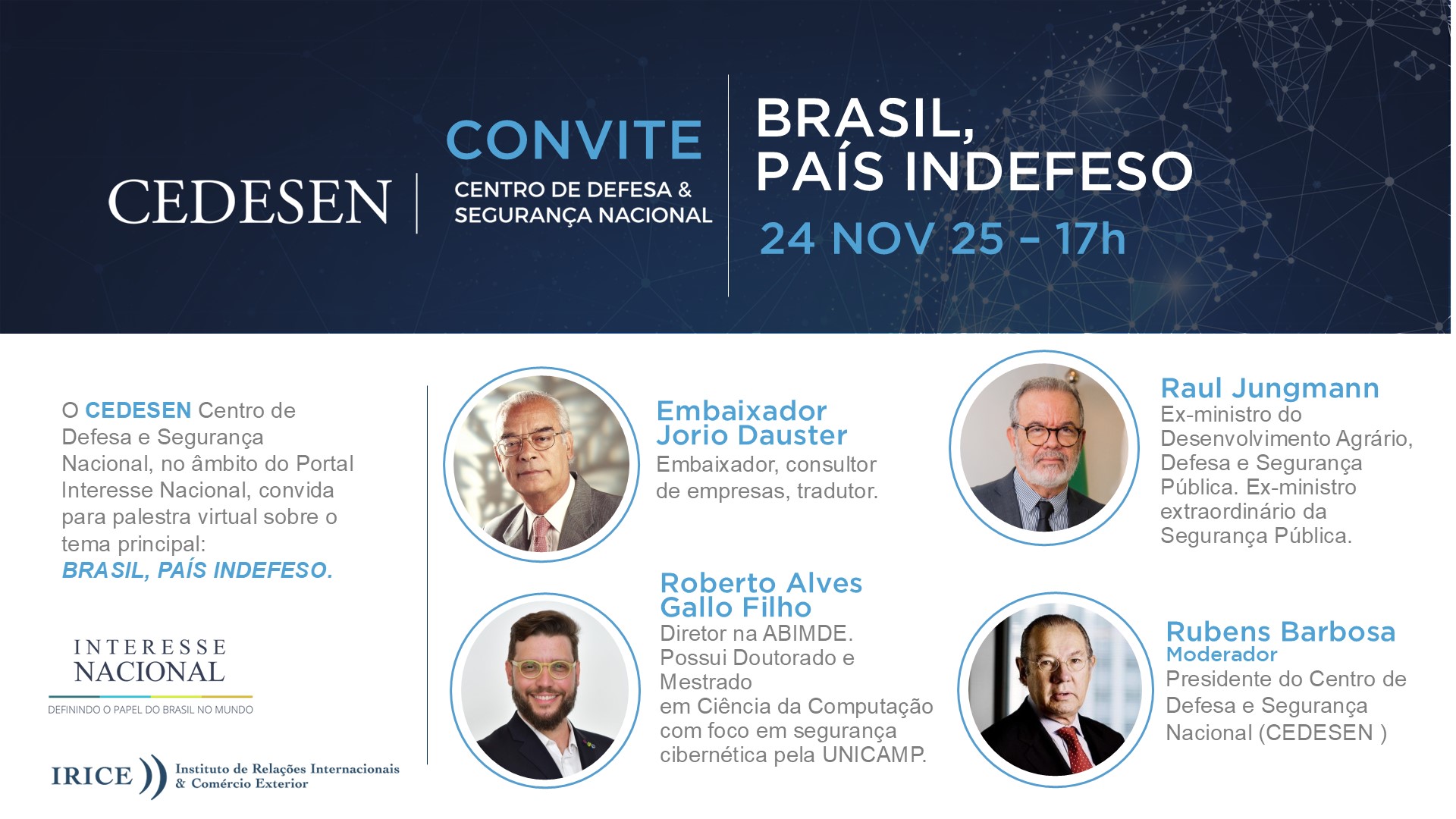 CENTRO DE DEFESA & SEGURANÇA NACIONAL (CEDESEN) tem como principais objetivos o de promover o debate de temas relacionados à defesa e à segurança nacionais do ponto de vista do interesse do Brasil, bem como o de elaborar, estimular e divulgar, em caráter sistemático, ideias, ensaios, artigos e pesquisas sobre Defesa e Segurança do Brasil, pelos meios de comunicação mais efetivos, eficazes e adequados.